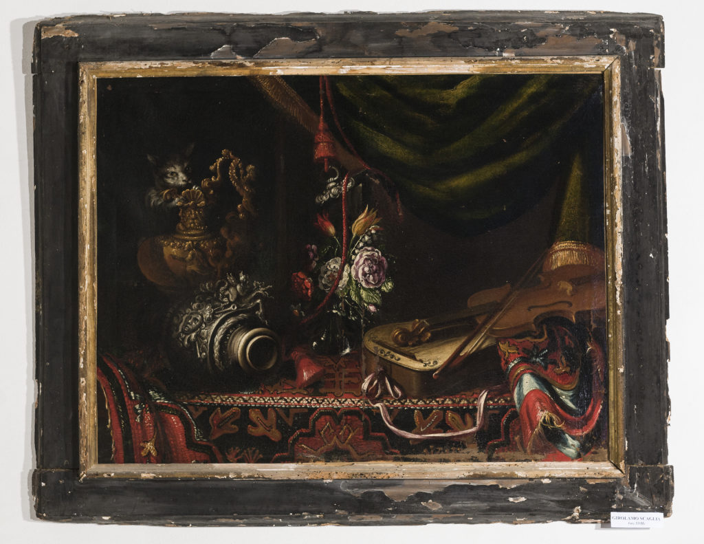 Descrizione | La natura morta di Girolamo Scaglia, nei toni scuri e nella meditata gestione del lume, si inserisce nella tradizione pittorica caravaggesca, tendenza artistica del secolo decimo settimo. Lo studio del dato vegetale e animale, la presenza di un oggetto come il violino che rende la composizione sinestetica richiama le opere di Michelangelo Merisi da Caravaggio realizzate per il cardinal del Monte e quelle dei seguaci come Bartolomeo Manfredi o il lucchese Paolini. Lo studio della realtà del quotidiano e del mondo naturale e vegetale si mescola, in opere come questa, a significati simbolici concernenti i concetti di vita e morte, peccato e virtù. La curiosa presenza del gatto è dovuta a gusto estetico e di mimesi della natura nel contesto di una ricostruzione di una scena che fosse visibile in una casa qualsiasi. |
